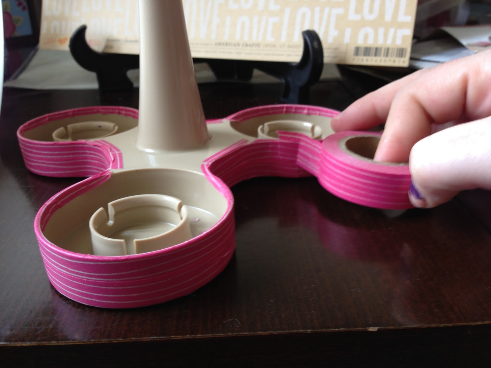 For the handle I layered long strips down the main part, and then wound pieces around the shaped handle. The washi tape was really forgiving so if I missed a spot I could just peel it back up have another go (or stick another piece over the top to cover my mistake) and with the cups back in the holder, noone will be looking to closely at the base (hopefully)